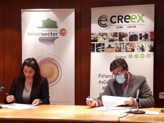 Badajoz, 28 de abril de 2021.La Confederación Regional Empresarial Extremeña (CREEX) y la Plataforma del Tercer Sector de Extremadura (PTSEX) han suscrito hoy un convenio que busca intensificar las líneas de cooperación que ya venían manteniendo, con el fin de afrontar retos como el de paliar el impacto de la crisis socioeconómica provocada por la pandemia en los colectivos más vulnerables.